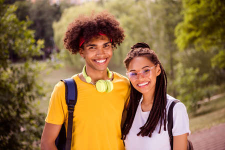 Portrait of attractive positive cheerful couple spending weekend free spare time fresh air at green forest wood outdoors