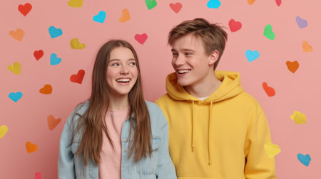 A cheerful couple enjoys the fun of Valentine's Day surrounded by colorful heart decorations. Their joyful smiles capture the essence of love and celebration.