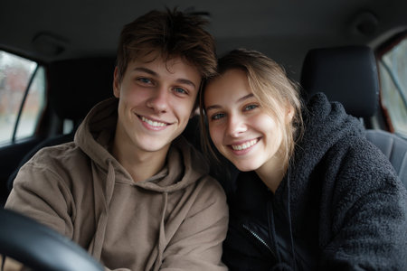 Smiling young man and girlfriend sitting in a car enjoying each other's company on a sunny day