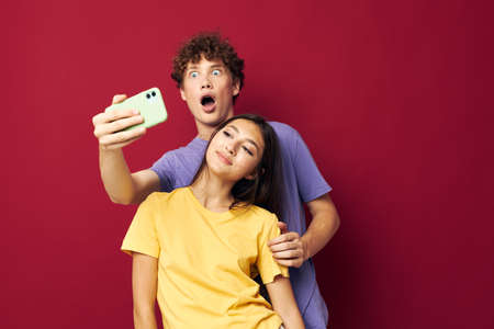 nice guy and girl in colorful T-shirts with a phone Youth style