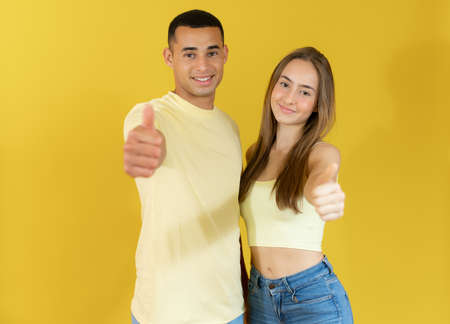 Happy young lovely couple showing thumbs up and looking at the camera over yellow background
