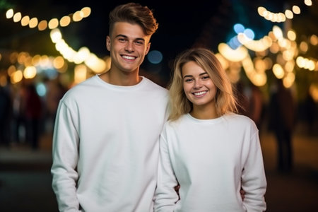 Happy merry male and female lovers of different age feel satisfied after unforgettable night enjoy togetherness stand closely wear casual clothes smile pleasantly Relatio : Generative AI