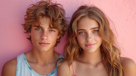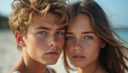 This captivating image features a close-up of a young man and woman, their faces gently touching, radiating warmth and connection. With striking blue eyes and sun-kissed skin, they embody the essence of youthful love and carefree summer days.