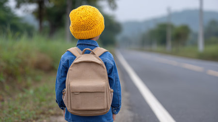 A young child, wearing a vibrant yellow beanie and carrying a backpack, stands alone on an empty road. The scene evokes adventure and innocence amid natural beauty.