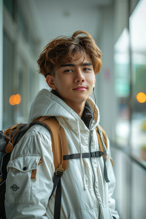 Asian student with a backpack at university. Young refugee man. Concept of immigrant education, refugee resilience, international education, diversity, cultural integration.