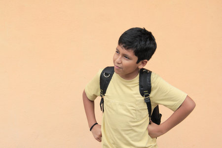 10-year-old Latino boy, excited and happy, uses his backpack with books to study and learn back to school