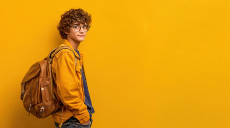 A young student with curly hair stands confidently against a bright yellow wall. He wears glasses and a casual outfit, holding a backpack, exuding a cheerful vibe.
