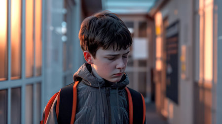 stressed-out teenage boy with a backpack, standing alone on a deserted street at dusk, with a worried expression and hands in pockets.