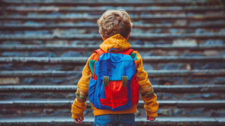 Child with a brightly colored backpack looking back while walking up the school steps, ready to start a new school year