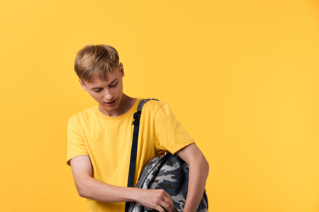portrait of a teenager boy with a backpack on a yellow background