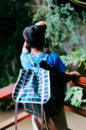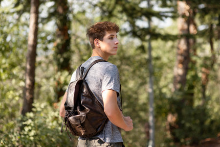 A boy with a backpack walks through the forest, a child explores wildlife, a kid stands alone among the trees, a portrait of a boy