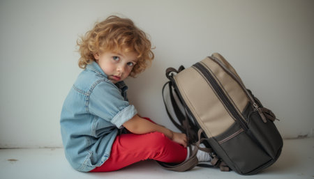 A young child with curly blonde hair sits pensively next to a modern backpack, exuding a sense of curiosity and wonder. The soft lighting highlights the childs expressive eyes and the vibrant colors of their outfit, creating a warm and inviting atmosphere.