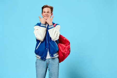 handsome friendly attractive redhead young man student standing with red backpack and trendy jacket ready for new study season. Horizontal photo with empty space