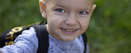 A boy of preschool age takes a selfie. Close - up of a child