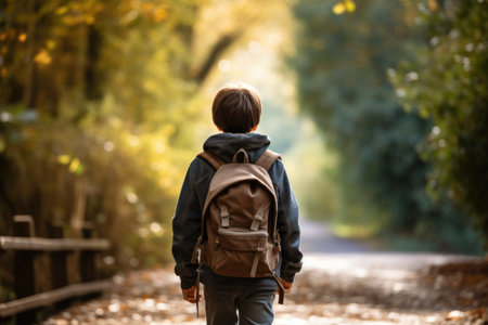 A child walks away, carrying a backpack, surrounded by autumn foliage in a serene setting.