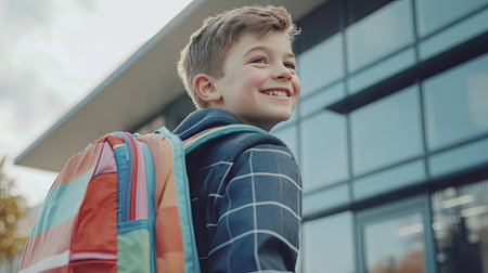 Boy with a colorful backpack standing outside a school building, looking over his shoulder with a big smile as he heads to class