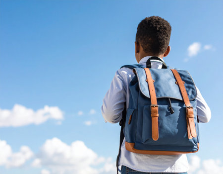A young boy with a blue backpack looks up into a bright blue sky filled with soft clouds. A perfect moment of childhood curiosity and new