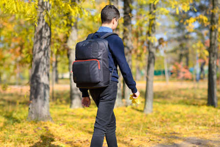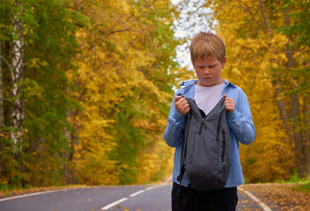The boy stands on the road and looks into the school bag. Sunny autumn day.