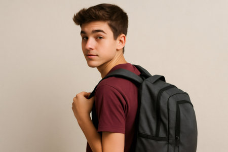Young male student carrying a backpack, walking while turning his head to look over his shoulder, embodying a casual campus lifestyle