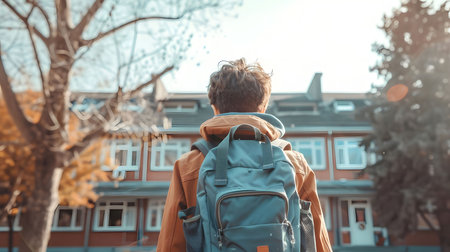 One boy pupil with a new backpack in front of the school. Welcome back to school. New educational year semester.