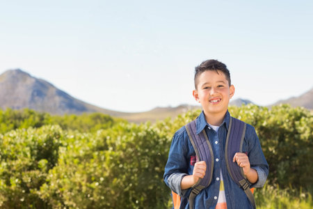 Portrait of smiling african american boy with backpack on top of mountain