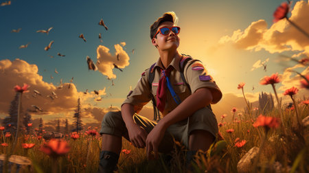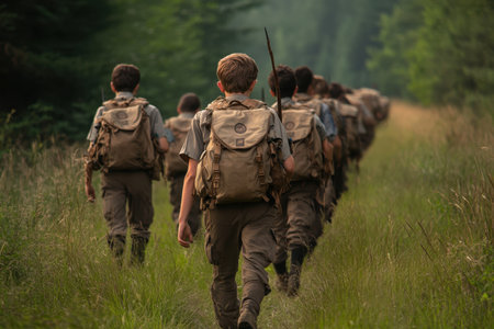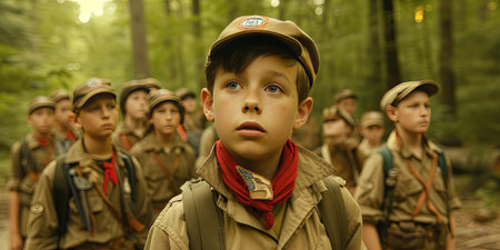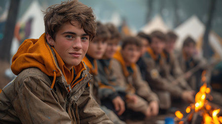 Young Scout Sitting by Campfire, Group Gathering, Outdoor Adventure, Team Spirit, Autumn Camp