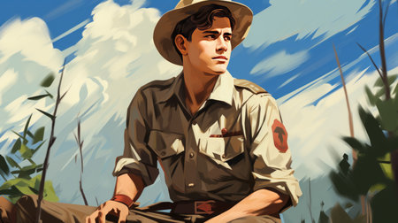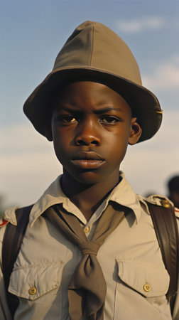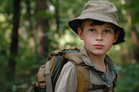 This captivating image portrays a youthful explorer adorned in safari gear, their gaze fixed intently upwards Their khaki clothing and broad-brimmed hat evoke a sense of adventure and preparedness for the uncharted wilderness The upward-pointed finger suggests a readiness to embrace discovery and ignite curiosity, inviting viewers to embark on a journey of exploration and learning amidst nature's wonders AI Generative