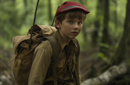 A young boy with striking features looks directly at the camera while wearing a brown backpack. Other children are blurred in the background, hinting at a summer camp atmosphere in a lush green forest.