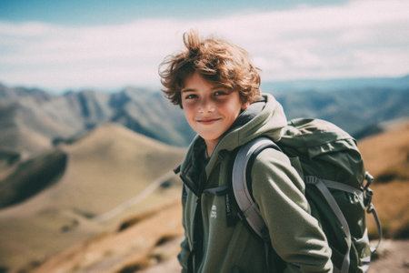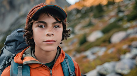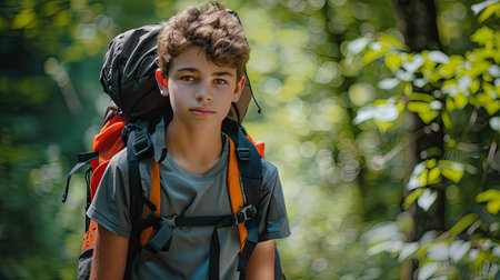 Teen boy with backpack, looking confidently at the camera during a hiking trip in nature