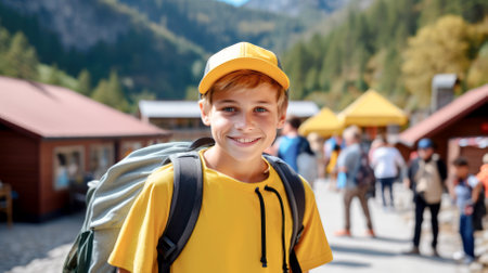 A cute boy in a cap and with a backpack came to relax at a children's camp. High quality photo