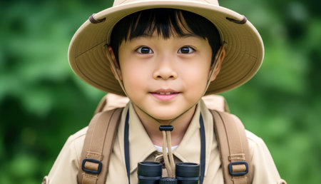 Boy Scout, a Thai Asian young boy scout in uniform exploring with binocular in the forest