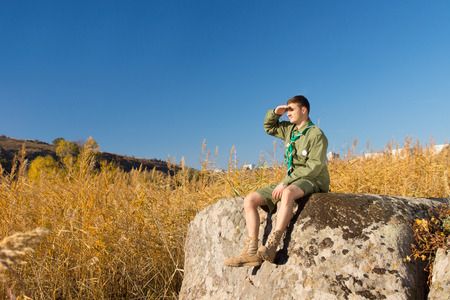Male Scout Sitting on Huge Rock Surveying the Wide Landscape at the Camp Area with Tall Brown Grasses.