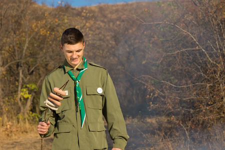 Scout preparing to cook sausages on a fire standing looking down at the smoke while holding the sausages threaded on a skewer or stick
