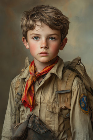 A young explorer stands confidently, gazing upwards with a look of determination. He wears a tan shirt and an orange scarf, with equipment suggesting an adventure. The background is textured, complementing his pose.
