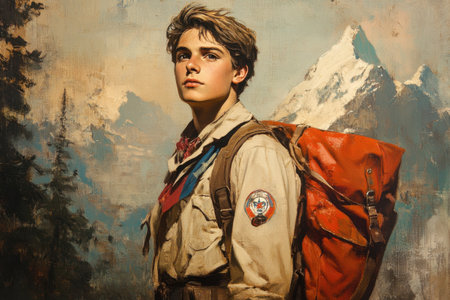 A young boy stands proudly against a backdrop of towering snow-capped mountains, wearing a scout uniform and an orange backpack. His expression shows determination as he embarks on an outdoor adventure, surrounded by nature.