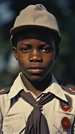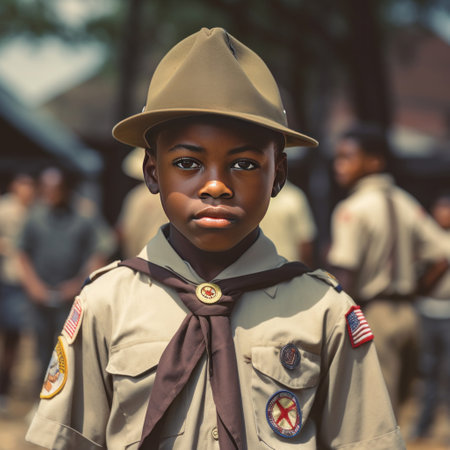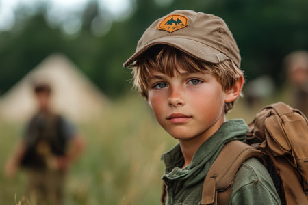 A young boy in a brown camping uniform stands near a cluster of tents, holding a stick. His thoughtful expression contrasts with the vibrant background of summer greenery and other campers engaged in various activities.