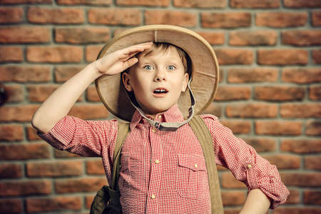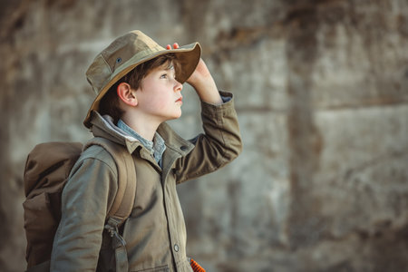 Young Boy Explorer Outdoors in Hat with Backpack Against Rustic Wall.