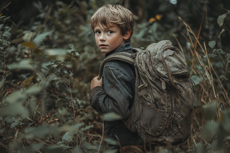 A young boy is lost in the woods, clutching a backpack while trying to find his way through thick grass and bushes.
