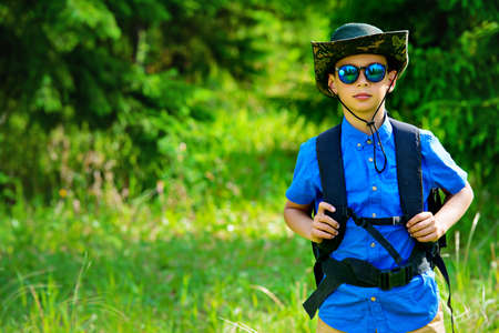 Ten year old boy go hiking with backpack. Exploring the world. Summer holidays. Outdoor activities.