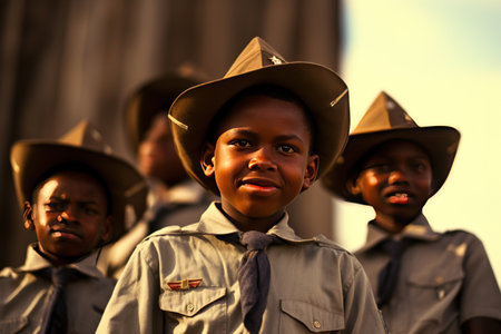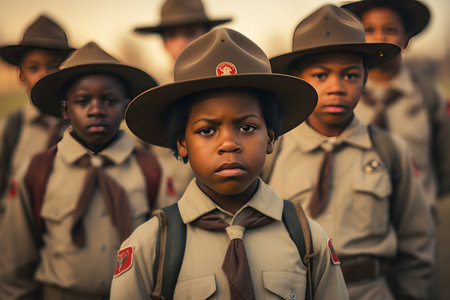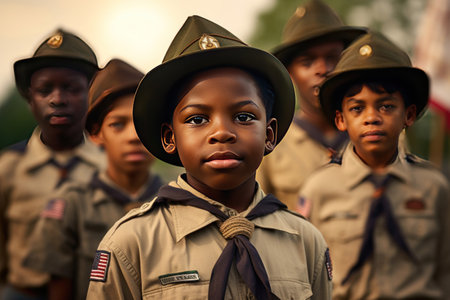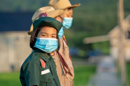 Boys Scouts wearing face mask during corona virus and flu outbreak. Boy and girl going back to scout camp after covid-19 quarantine and lock down.