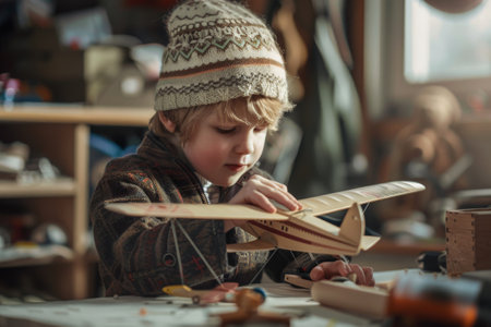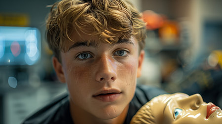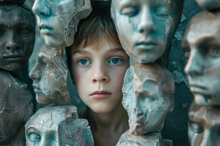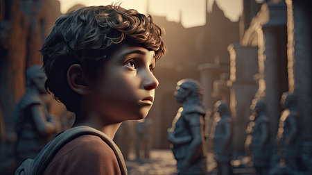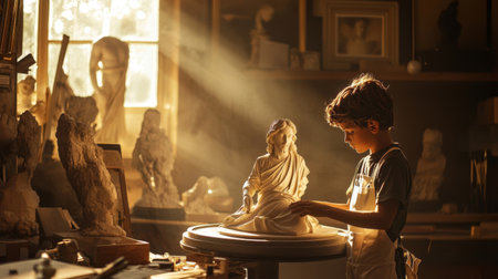A young boy is diligently working on crafting an intricate statue inside a welllit studio filled with inspiring artwork and tools