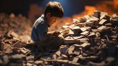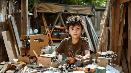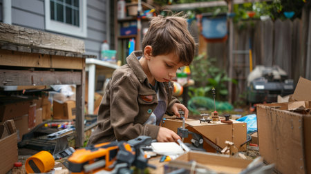 An image capturing a child in their backyard, surrounded by a makeshift workshop of cardboard, tools, and gadgets, engrossed in building a fantastical invention with wide-eyed wonder and determination.