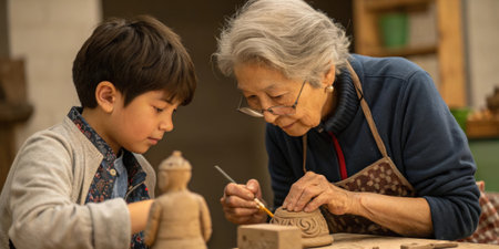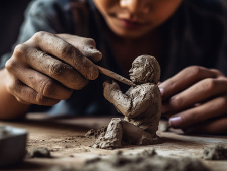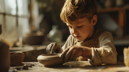 A 9 year old boy explores the art of pottery making in a creative workshop, molding clay into beautiful masterpieces. AI Generative AI