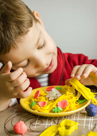 Cute child playing with his original spaghetti dish, made with colorful plasticine