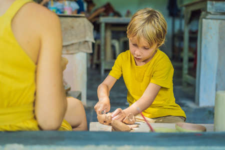 mother and son doing ceramic pot in pottery workshop. What to do with children. Child friendly place