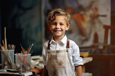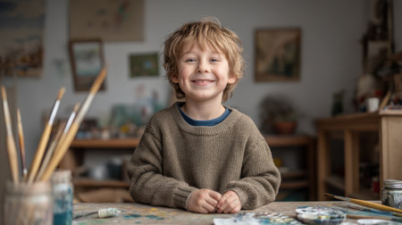 A joyful child mixes paints on a table, surrounded by brushes and art supplies, showcasing creativity and happiness in a bright studio environment.