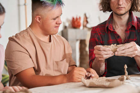 Sculptor preparing shape of the future plate and showing it to his students with special needs