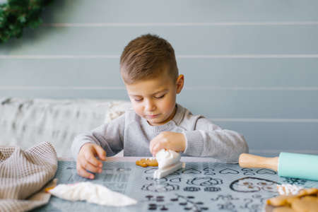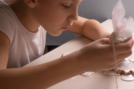 A 10-year-old boy glazes cookies with a culinary bag. Handmade. Childrens creativity.