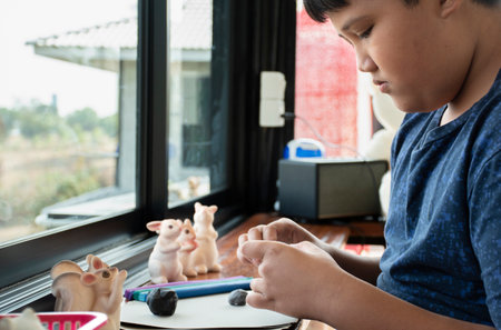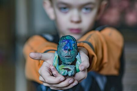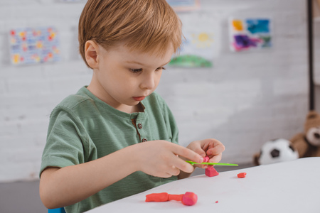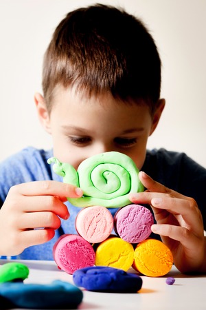 Child is sculpting with modeling clay. Art activity for children, indoor fun for kids concept. Close up and selective focus face and hands boy. Fun time for children activity at home or school.