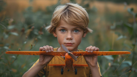 Cute boy playing with toy airplane . The child holds a toy airplane in his hands against the background of nature.